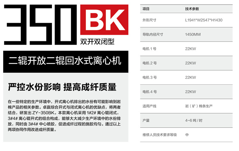 Product Introduction: The ZY350BK two-roll open-type centrifuge with two-roll recirculation design strictly controls moisture to improve fiber quality. In certain production environments, the moisture discharged from open centrifuges can affect the relevant parameters of rock wool products. Zhuoying has combined the advantages and disadvantages of open and closed centrifuges to develop the ZY-350BK. This centrifuge uses a combination of closed-type (1# and 2#) centrifugal rollers and open-type (3# and 4#) centrifugal rollers, which greatly reduces moisture discharge in the production environment. Simultaneously, the center of the 3# and 4# rollers is sprayed with adhesive, promoting uniform sizing during the fiber formation process. These two synergistic effects improve fiber quality.