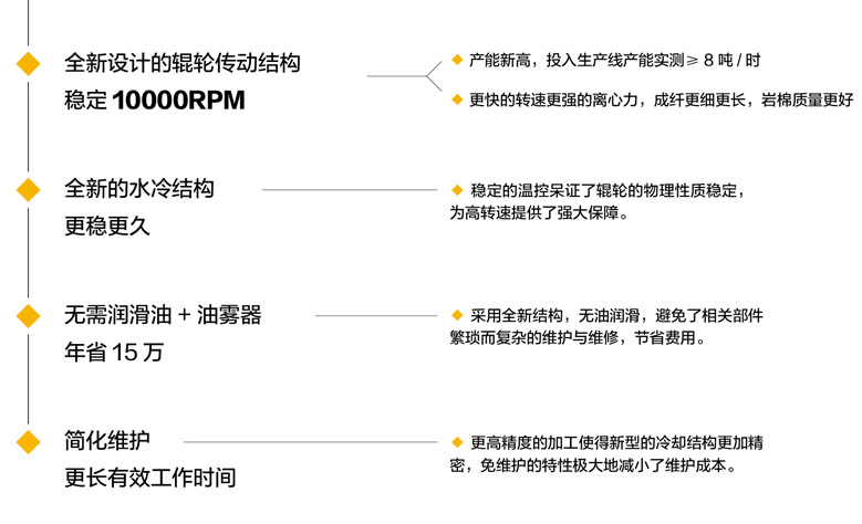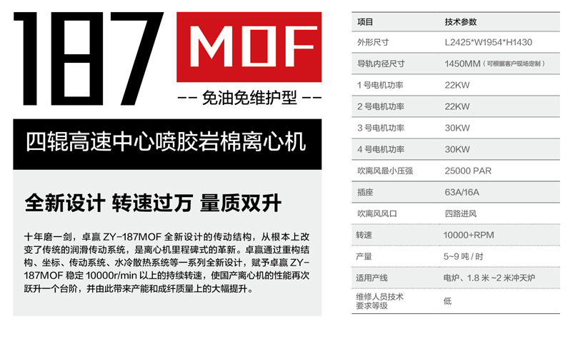 Product Introduction: The ZY187MOF (oil-free and maintenance-free) four-roller high-speed center-bonded rock wool centrifuge features a completely redesigned speed exceeding 10,000 r/min, resulting in a significant improvement in both quantity and quality. Ten years in the making, the Zhuoying ZY-187MOF boasts a newly designed transmission structure that fundamentally changes the traditional lubrication transmission system, representing a milestone innovation in centrifuges. Through a series of completely redesigned components, including the structure, coordinate system, transmission system, and water-cooling system, Zhuoying has given the ZY-187MOF a stable continuous speed of over 10,000 r/min, elevating the performance of domestically produced centrifuges to a new level and leading to substantial improvements in both production capacity and fiber quality.